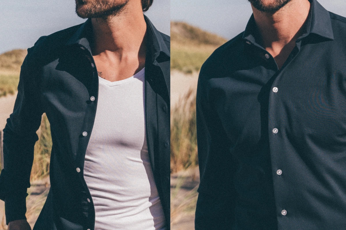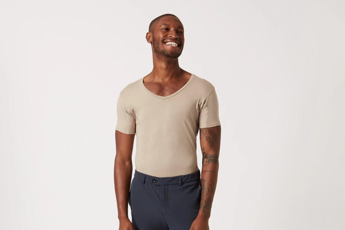 Entwickelt als unsichtbare Schicht zwischen dir und deinem Hemd. Der V-Ausschnitt erlaubt mehrere offene Knöpfe! Wähle Khaki für helle Hemden und Schwarz für dunkle Hemden – für den bestmöglichen unsichtbaren Look.