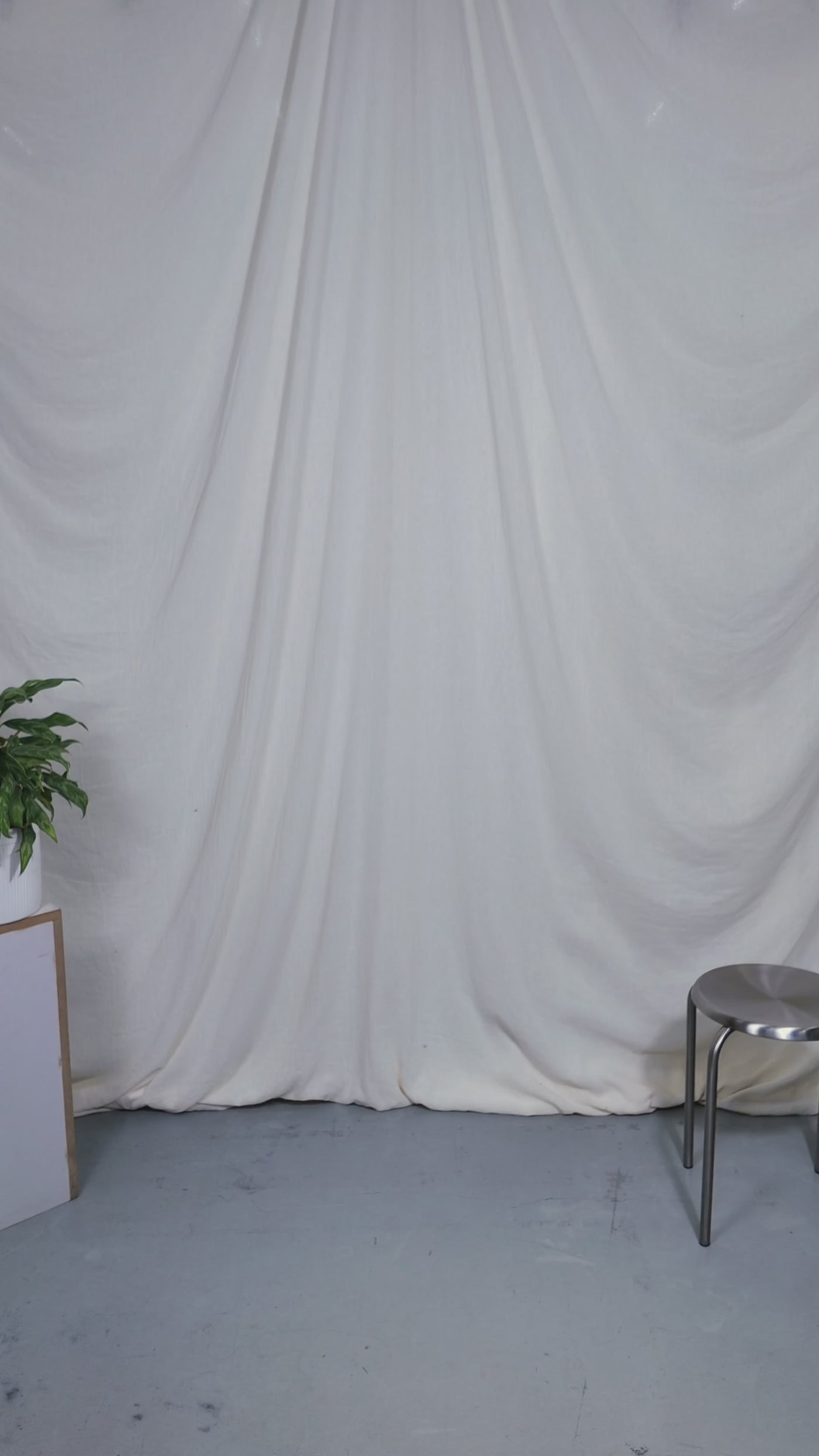 Two people sitting on a stool in a studio setting with photography equipment.